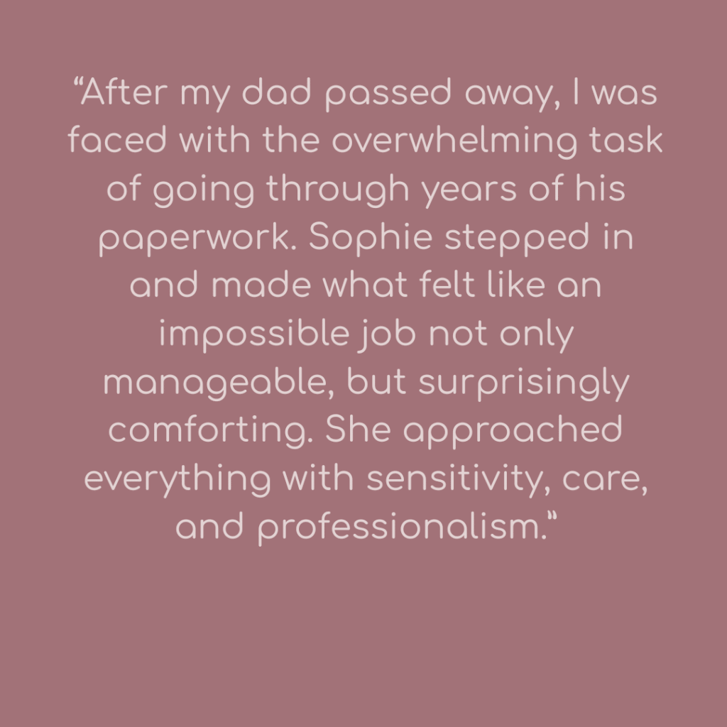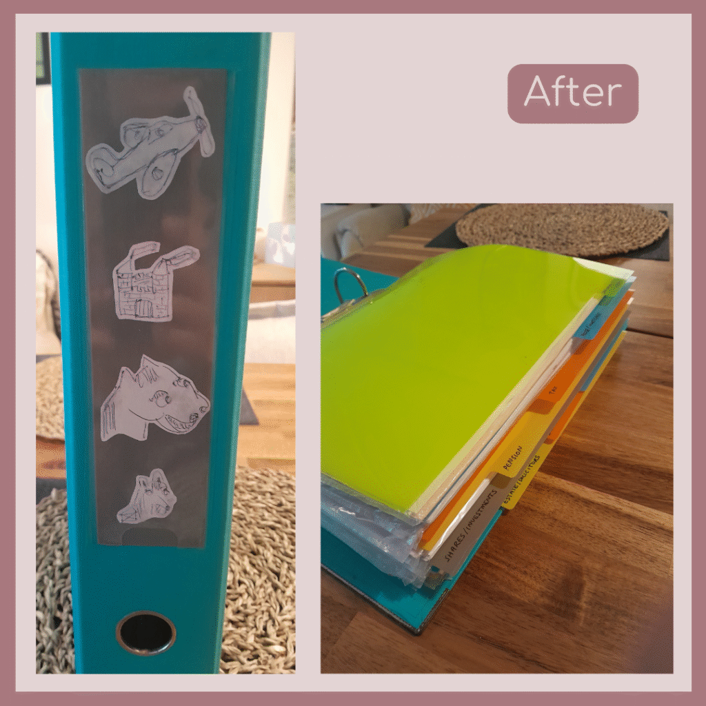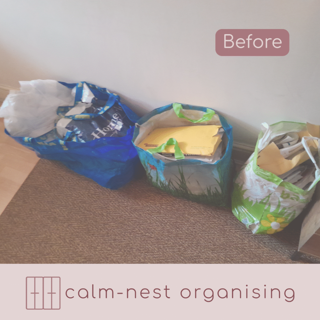 This paperwork had built up during a difficult time. We worked together to shed what was no longer needed and organise the rest into a simple, easy-to-find system. The client shared that the process was “surprisingly comforting”.