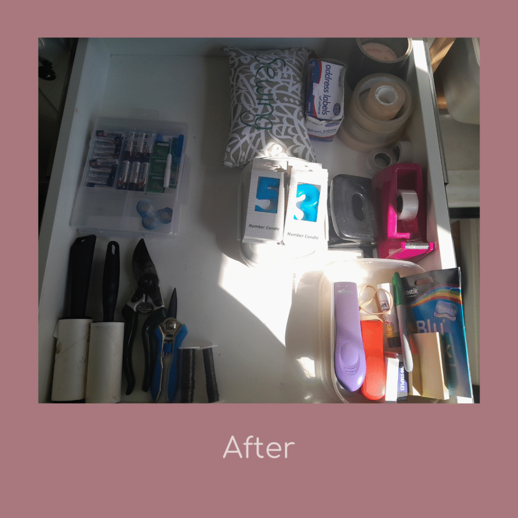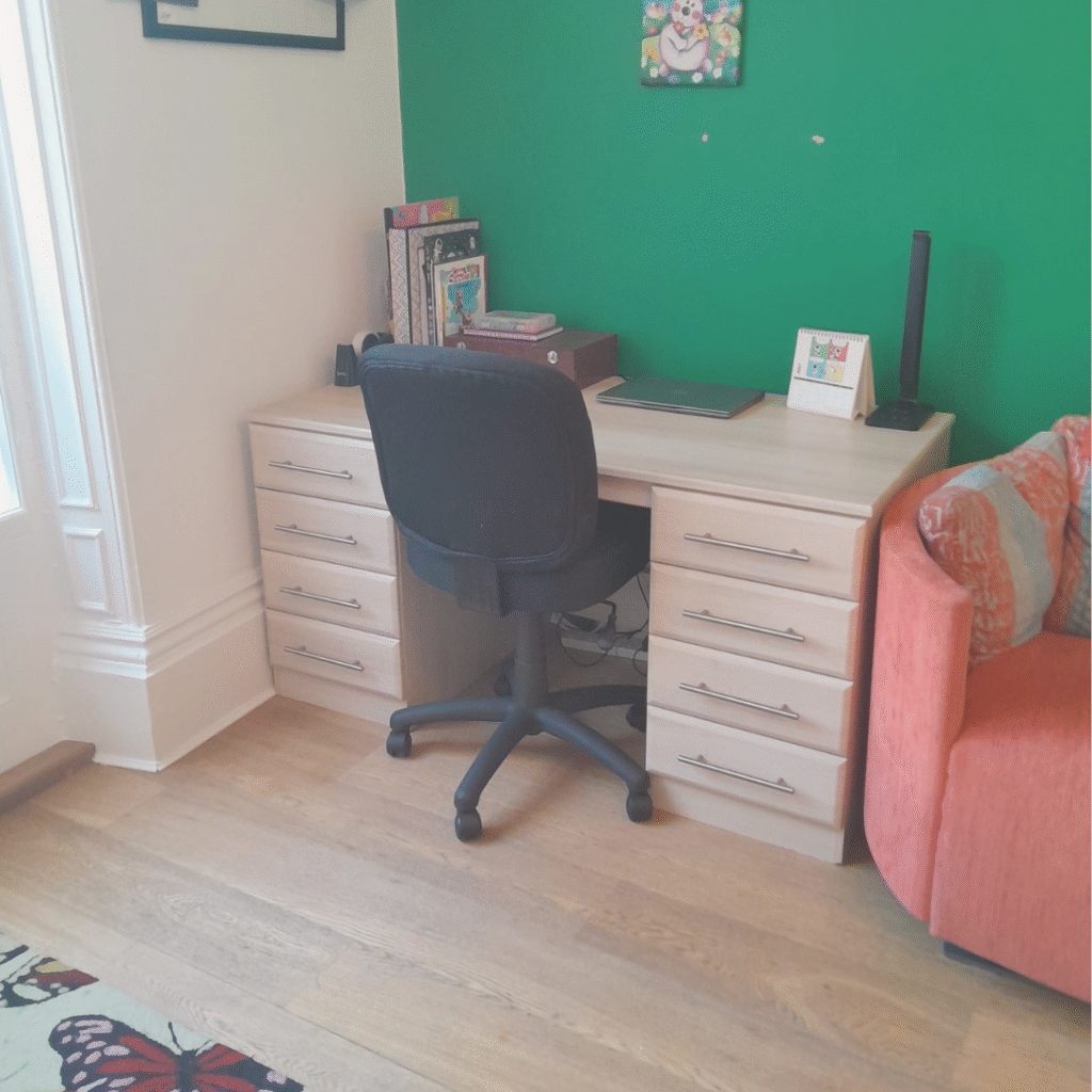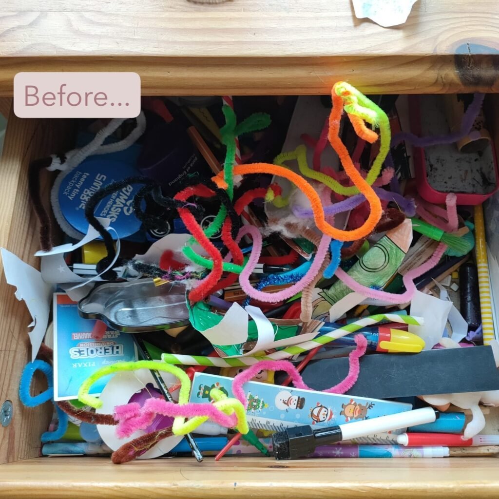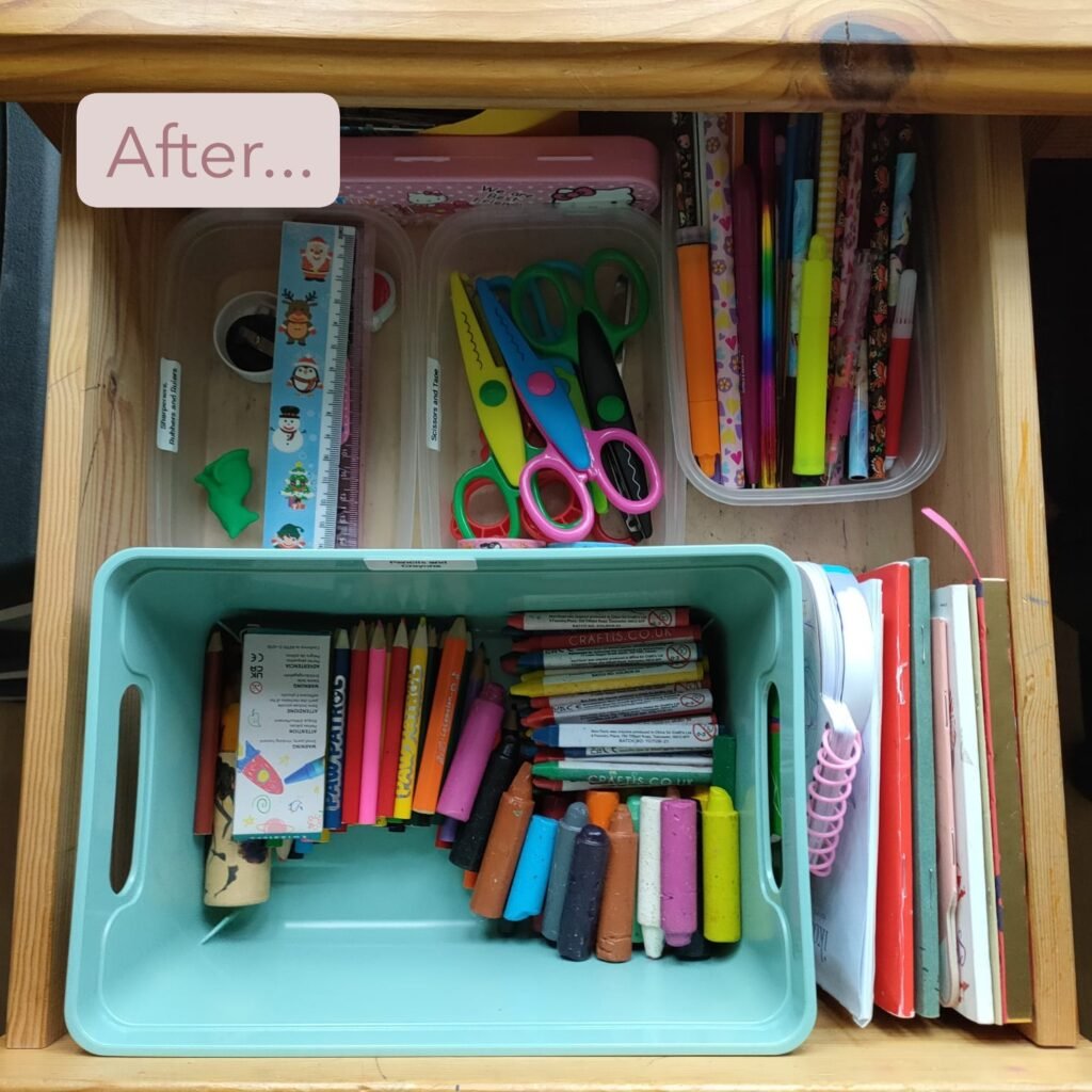 This playroom desk was overflowing with craft supplies. We created a clear workspace with labelled drawers and easy access, so creativity can flow without the clutter.