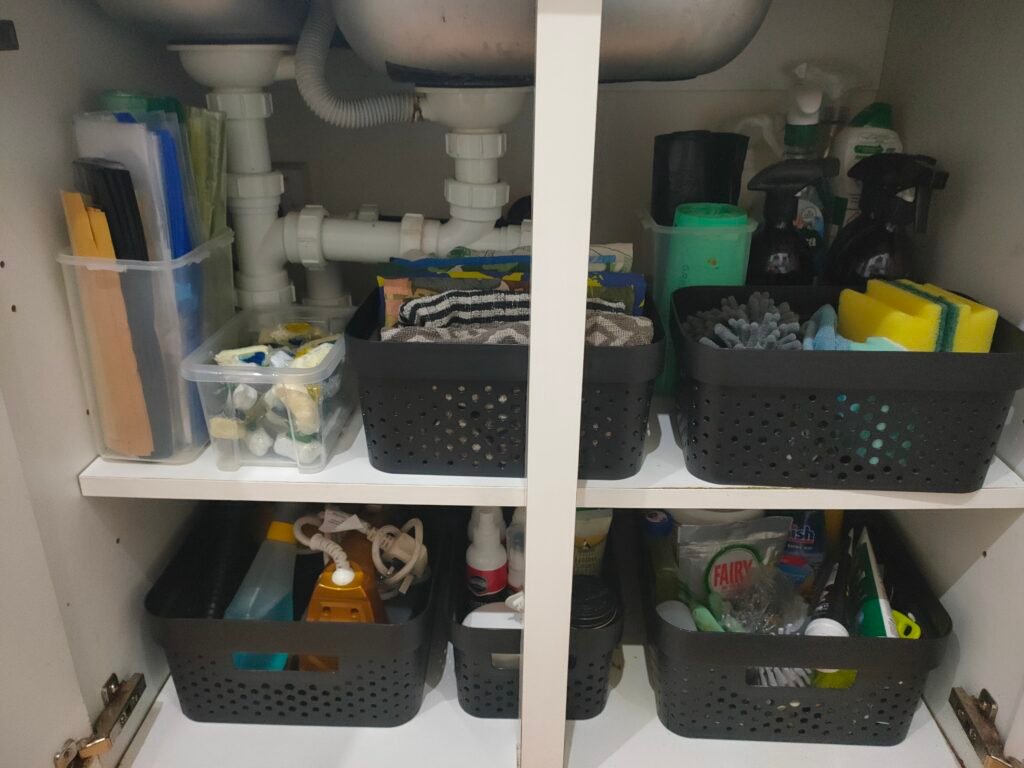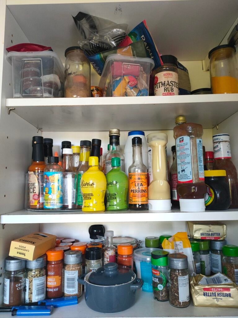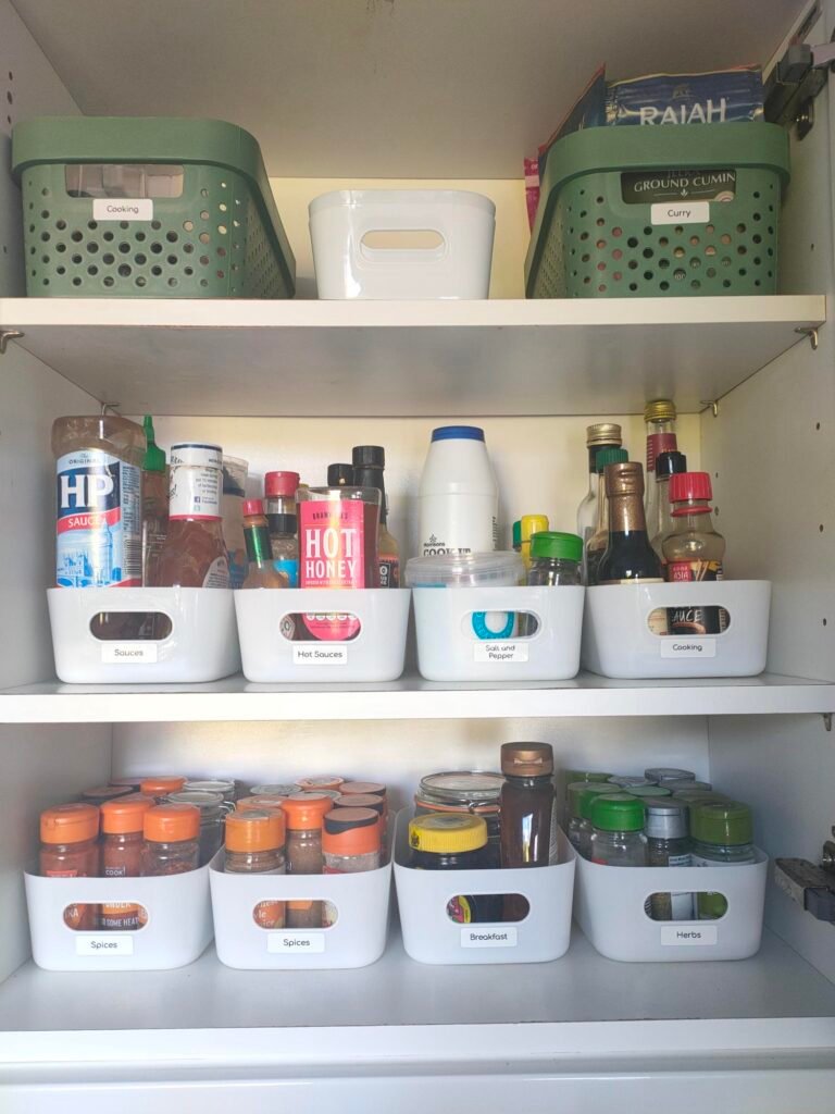 These kitchen cupboards were deep, making them tricky to navigate. We added containers and simple zones to make everything easy to see and reach – no more forgotten herbs at the back!